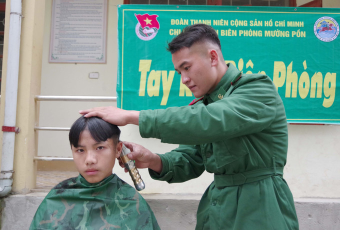 Chiến sĩ biên phòng Bộ đội Biên phòng tỉnh Điện Biên cắt tóc cho trẻ em các xã biên giới trong Chương trình “Xuân Biên phòng ấm lòng dân bản” Tết Qúy Mão năm 2023. Ảnh: TTXVN phát
