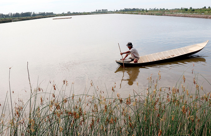 Ông Danh Quơl trên vuông tôm rộng hơn 1 ha của hai vợ chồng ở ấp Chòm Cao, xã Ninh Thạnh Lợi A, huyện Hồng Dân (Bạc Liêu). Ảnh: An Hiếu