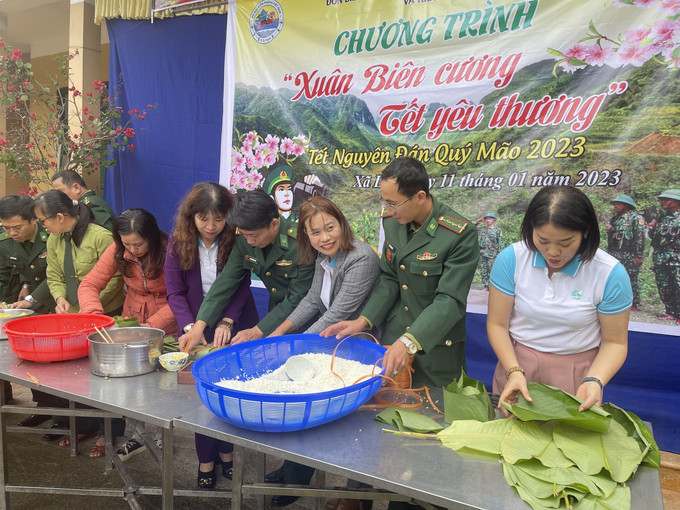 Các cán bộ, chiến sỹ Đồn Biên phòng Thanh gói bánh chưng cùng người dân chuẩn bị đón Tết. Ảnh: TTXVN Không phải lần đầu ở lại trực Tết tại đơn vị nhưng Đại úy Nguyễn Hoàng Tâm (32 tuổi), Trạm trưởng Trạm Kiểm soát Biên phòng Xy - Đồn Biên phòng Thanh vẫn thấy lòng mình lắng lại trong những ngày cận Tết. Sau những giờ làm việc và huấn luyện, anh tranh thủ gọi điện về nhà hỏi thăm tình hình chuẩn bị đón Tết. Hiểu được trọng trách của người lính Biên phòng, anh luôn cố gắng hoàn thành tốt nhiệm vụ được giao.