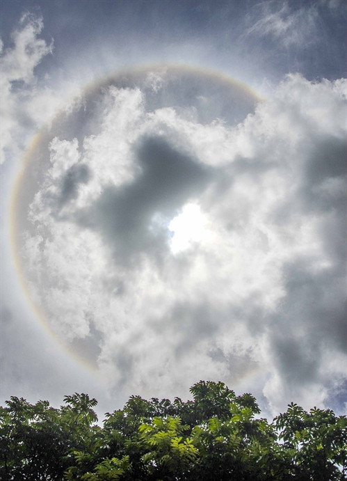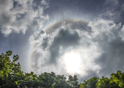 | Quầng sáng tròn lớn có màu sắc tương tự cầu vồng bao quanh mặt trời (ảnh chụp lúc 11 giờ ngày 8/7/2016). |