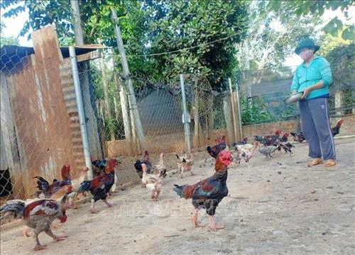 | Bà Lê Thị Ngọc Hà chăm sóc đàn gà Đông Tảo. Ảnh: Tuấn Anh-TTXVN |
