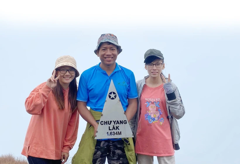 Y Xim Ndu chụp hình kỷ niệm cùng du khách trên đỉnh núi Chư Yang Lắk. Ảnh: NVCC