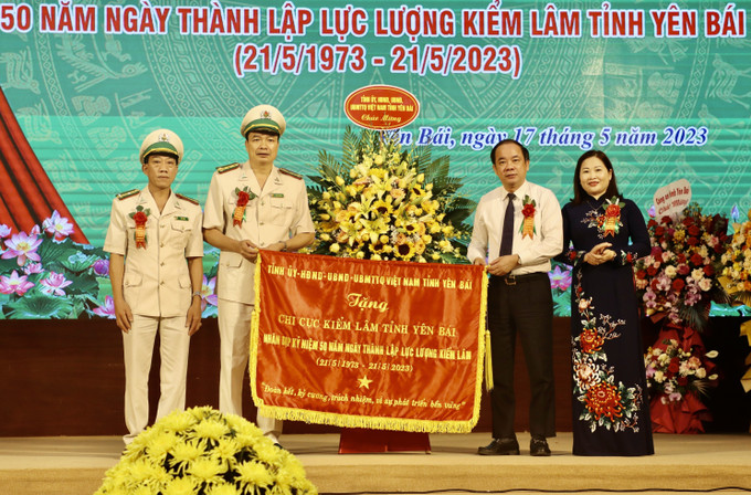 Phó Bí thư Thường trực Tỉnh ủy Tạ Văn Long và Phó Chủ tịch UBND tỉnh Vũ Thị Hiền Hạnh tặng hoa và cờ thêu chúc mừng lực lượng kiểm lâm tỉnh Yên Bái. Ảnh: Tuấn Anh -TTXVN