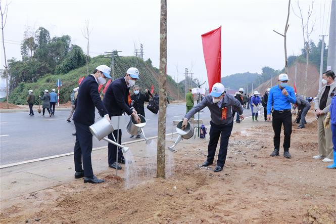 Ngay sau lễ phát động "Tết trồng cây đời đời nhớ ơn Bác Hồ”, các đại biểu xuống cơ sở tham gia trồng cây đường phố tại xã Văn Phú, thành phố Yên Bái. Ảnh: Tiến Khánh – TTXVN.
