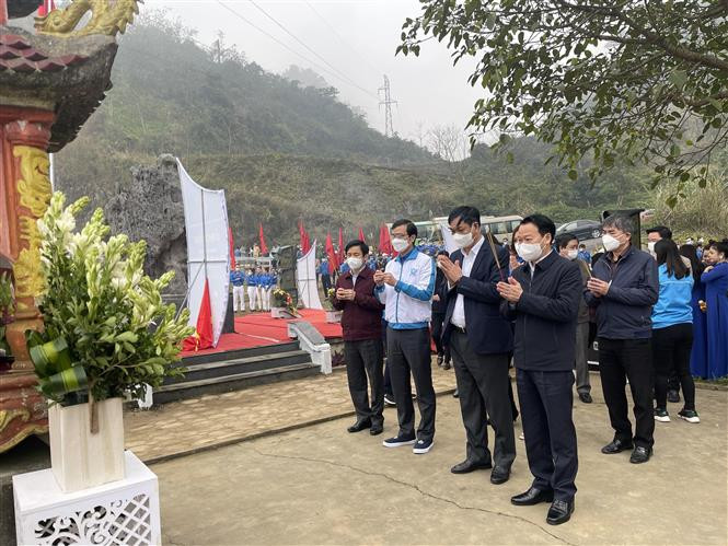 Các đồng chí lãnh đạo, đại biểu tham dự Lễ phát động dâng hương tại Khu Di tích lịch sử cấp Quốc gia Đèo Lũng Lô - Bản Dạ, xã Thượng Bằng La (Văn Chấn). Ảnh: Tuấn Anh - TTXVN