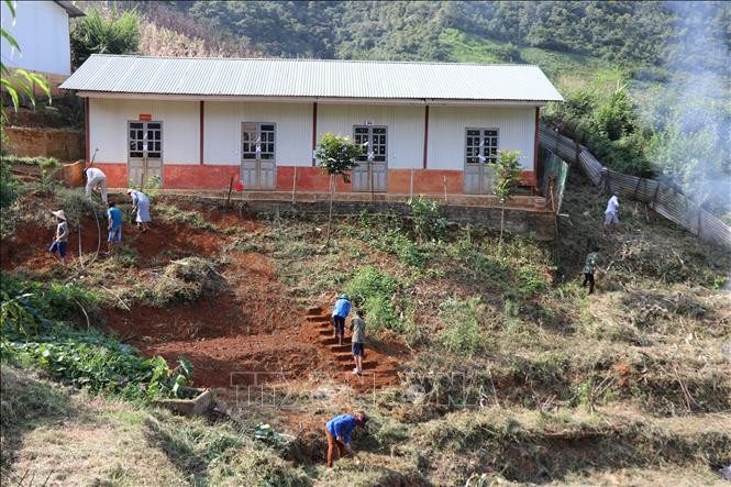 Các thầy giáo trường phổ thông Dân tộc bán trú Tiểu học và Trung học Cơ sở Tà Xi Láng (huyện Trạm Tấu, tỉnh Yên Bái) sửa chữa, chỉnh trang khuân viên trường học trước năm học mới. Ảnh: Tiến Khánh-TTXVN