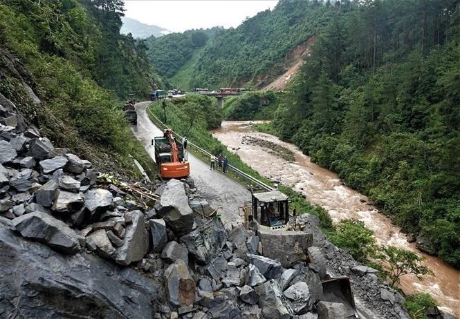 Lực lượng chức năng đang nỗ lực khắc phục điểm sạt lở để thông tuyến sớm nhất. Ảnh: TTXVN phát